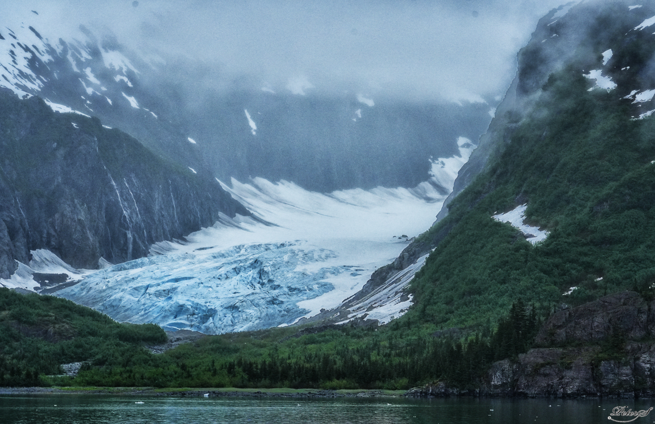 A hanging glacier flows out of the clouds