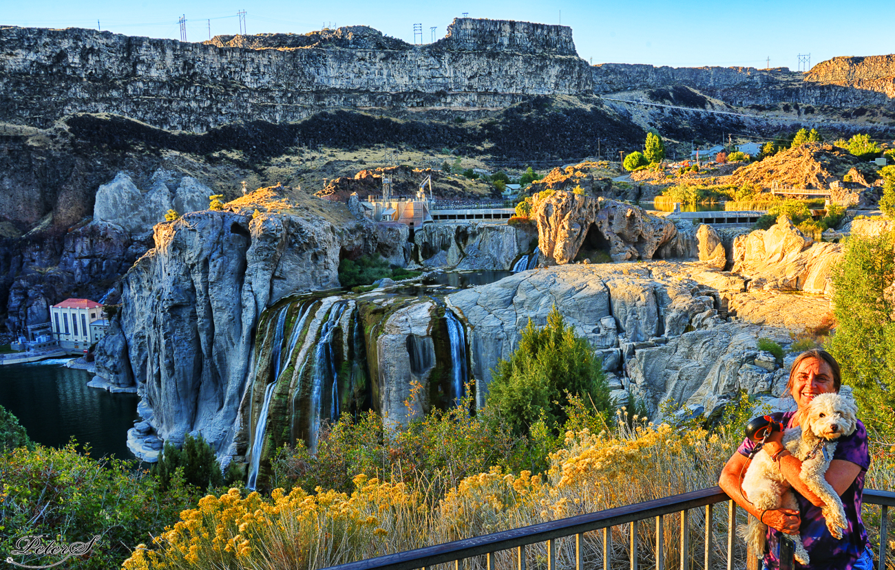 Edi and Hooch enjoy sunset colors at Shoshone Falls