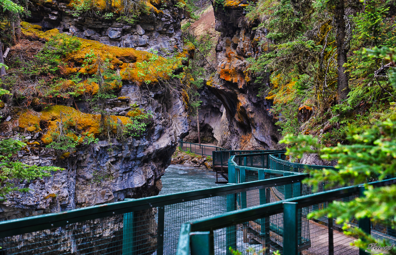 A slot canyon with a walkway