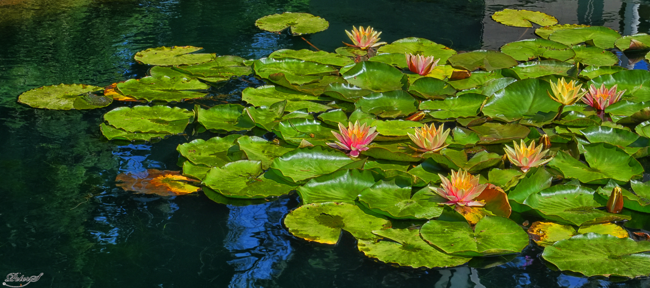 Lilly pads in reflecting pond with frog on leftmost pad