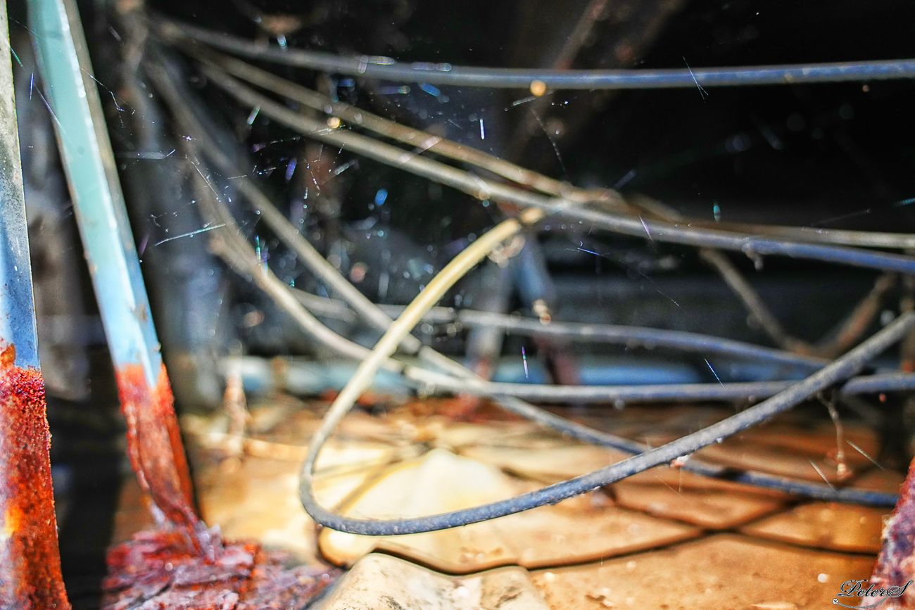 Near south wall. Jumble of low voltage wires and coax cables. Rusted support pier.