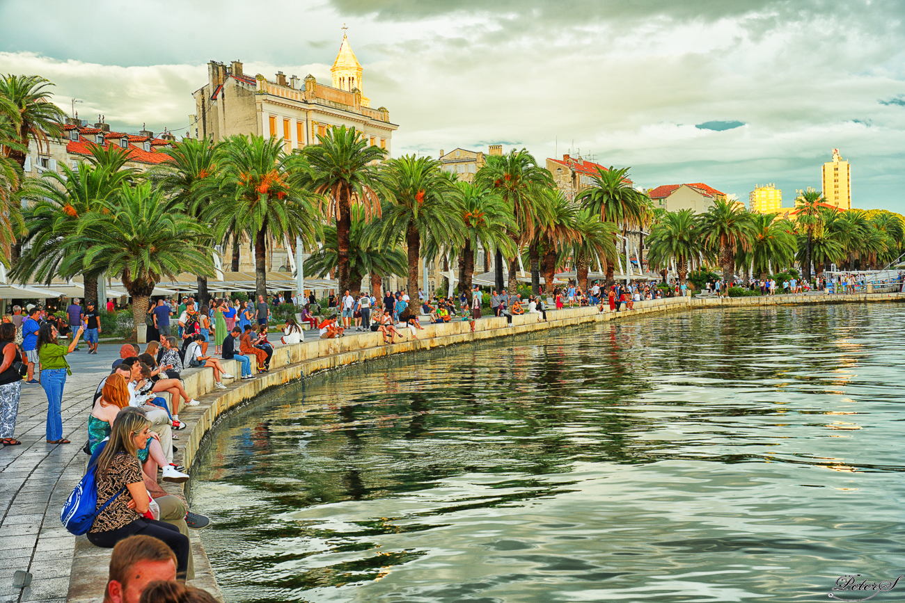 Locals and tourists sit around the harbor to unwind the day.