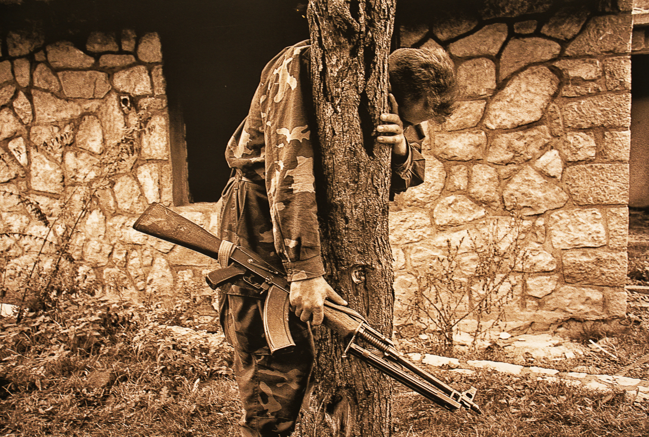 Museum photograph of a Croat soldier returning to his burnt out village in 1993