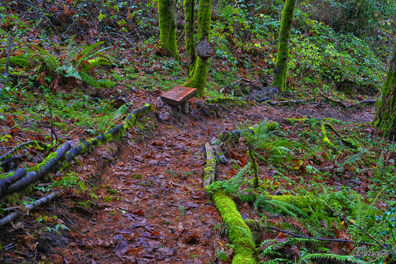 Bench #5 heading down into the lowland Plaque: Blessed is the servant who loves his brother as much when he is sick and useless as when he is well and can be of service to him. -- St. Francis